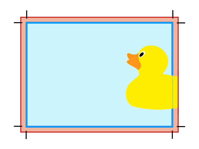Within this example you can see that the duck image needs to extend 3mm past the edge of the page (blue box) and into the bleed area (red box). The red area is then trimmed off after printing, this ensures the image goes to the very edge of the sheet.